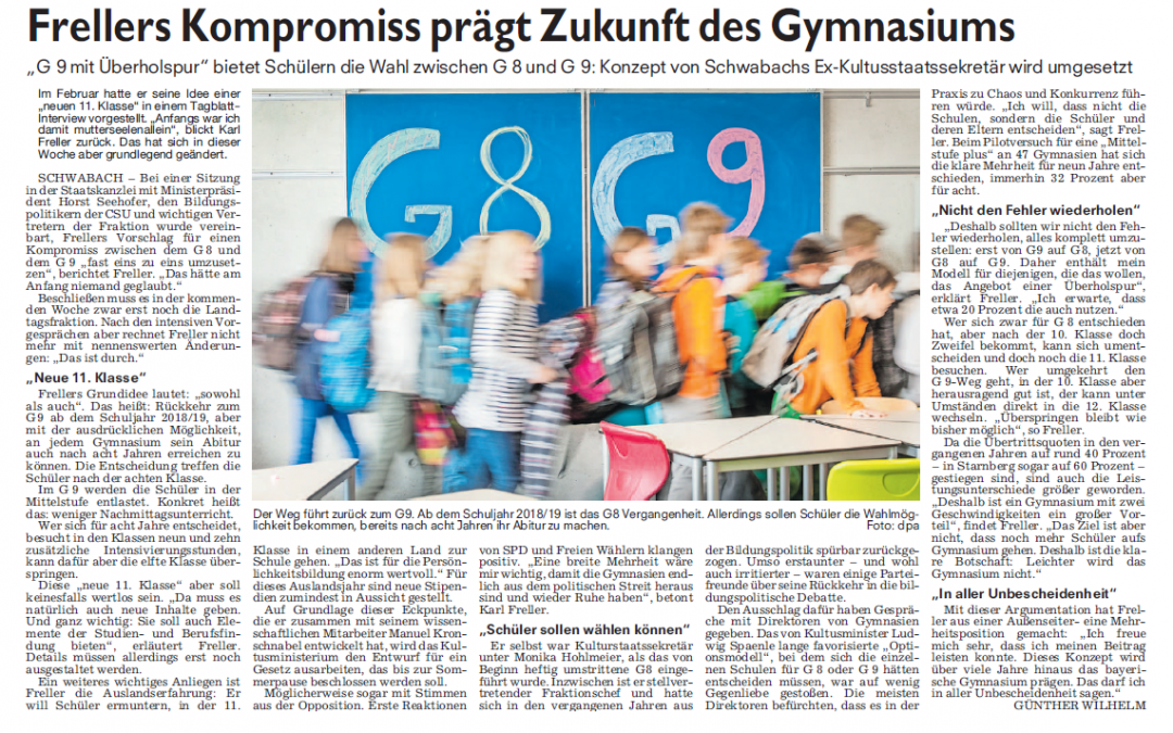 Er selbst war Kulturstaatssekretär unter Monika Hohlmeier, als das von Beginn heftig umstrittene G8 eingeführt wurde. Inzwischen ist er stellvertretender Fraktionschef und hatte sich in den vergangenen Jahren aus der Bildungspolitik spürbar zurückgezogen. Umso erstaunter — und wohl auch irritierter — waren einige Parteifreunde über seine Rückkehr in die bildungspolitische Debatte. Den Ausschlag dafür haben Gespräche mit Direktoren von Gymnasien gegeben. Das von Kultusminister Ludwig Spaenle lange favorisierte „Optionsmodell“, bei dem sich die einzelnen Schulen für G 8 oder G 9 hätten entscheiden müssen, war auf wenig Gegenliebe gestoßen. Die meisten Direktoren befürchten, dass es in der Praxis zu Chaos und Konkurrenz führen würde. „Ich will, dass nicht die Schulen, sondern die Schüler und deren Eltern entscheiden“, sagt Freller. Beim Pilotversuch für eine „Mittelstufe plus“ an 47 Gymnasien hat sich die klare Mehrheit für neun Jahre entschieden, immerhin 32 Prozent aber für acht.