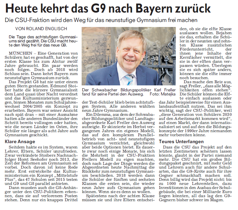 Die CSU-Fraktion wird den Weg für das neunstufige Gymnasium frei machen